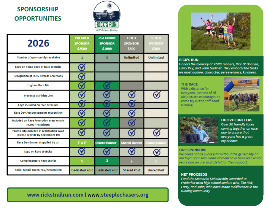 Without our generous sponsors, we would not be able to bring Rick's Run to life, while also raising significant funds for the Frederick Steeplechasers Memorial Scholarship.